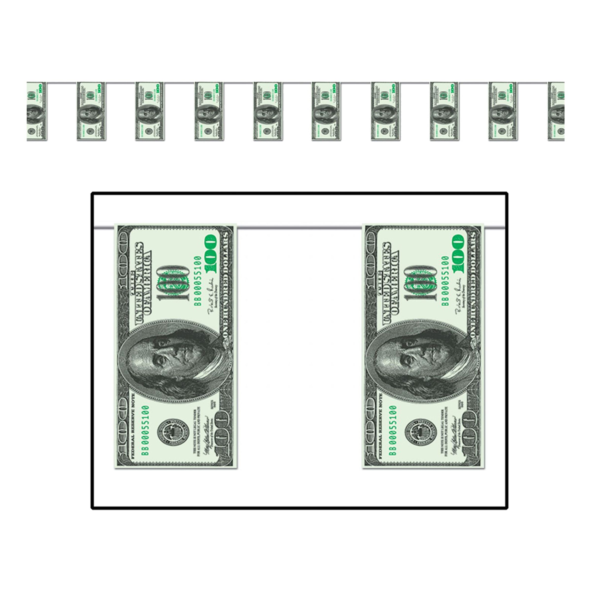Pengar styr världen heter det och här har du det ultimata festpyntet på just det temat: en girlang som är dekorerad med massvis av 100-dollarsedlar. Du fäster den enkelt i till exempel taket eller över en dörr för att förvandla vilket rum som helst till en pengastinn plats!