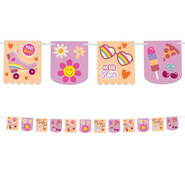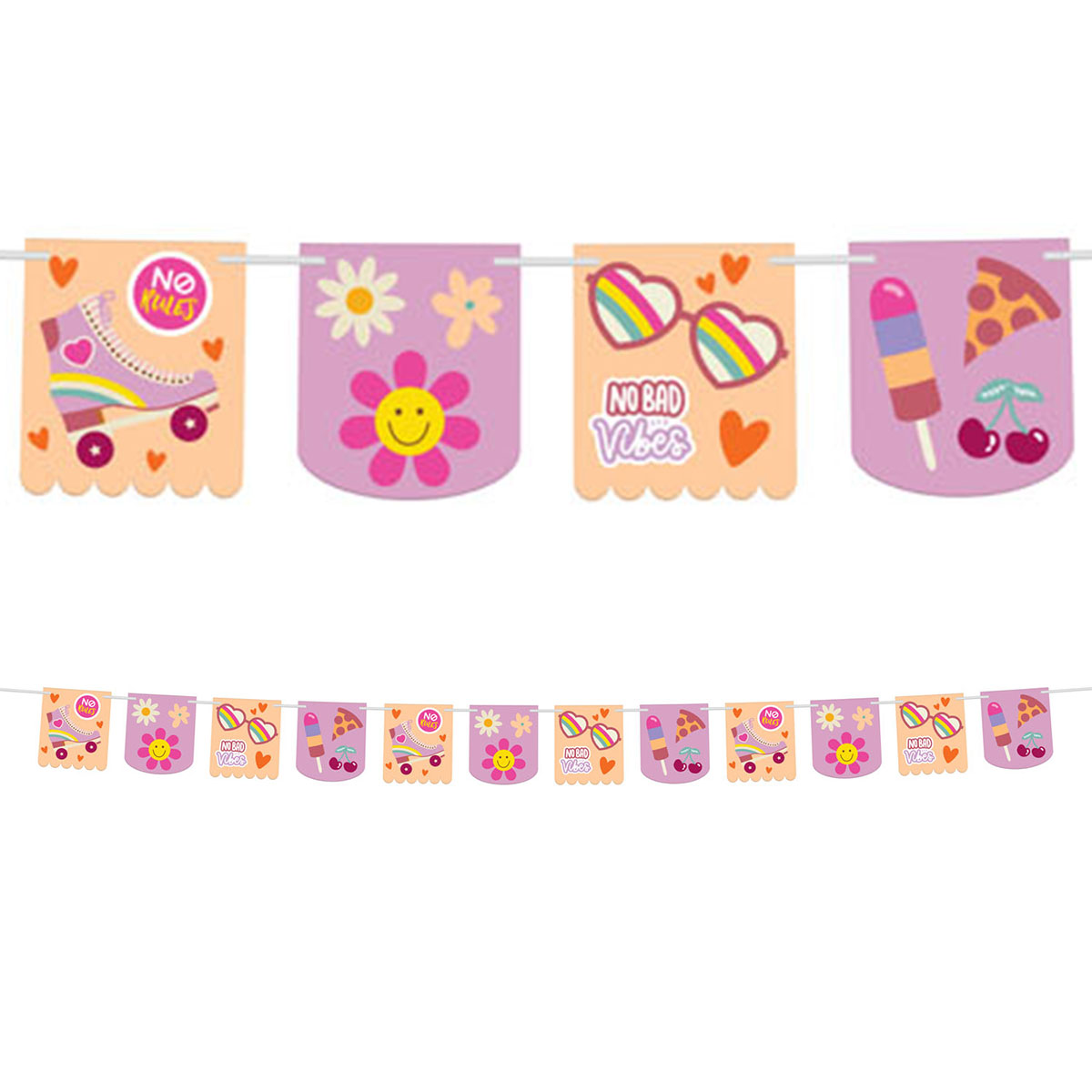 Flaggirlang Boho Girlz omfattar en girlang med röda hjärtan, blommor, en glass, körsbär, hjärtformade glasögon, en pizza, rullskridskor samt texterna "No bad vibes" och "No rules" mot en gammalrosa eller aprikosfärgad bakgrund.