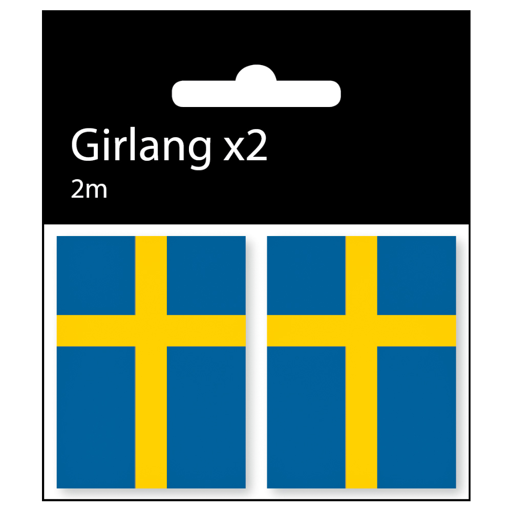 Flaggirlang Dekoration Sverige X-tra Mini omfattar två stycken girlanger med små svenska flaggor i papp. Flaggorna är ca 4 cm höga och 3 cm breda och hängs upp med 2 meter långt vitt snöre.