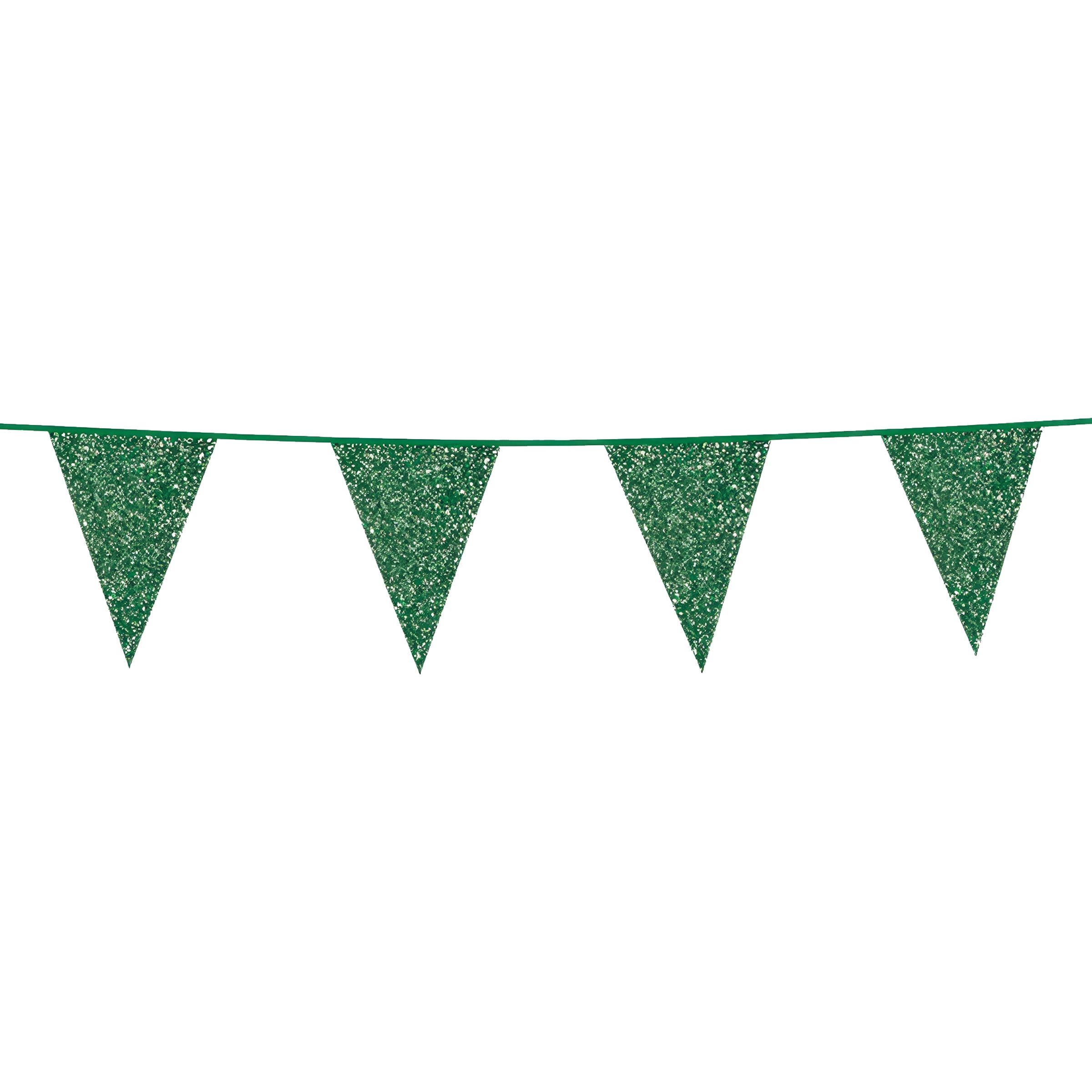 Flaggirlang Glitter Grön är en girlang som kan hängas i taket eller på väggen. Du kan använda den i dukningen som en snygg bordsdekoration. Färgen passar lika bra på barnkalaset som på julfesten och är snygg att matcha med färger som guld, silver eller rött. Den totala längden på girlangen är ca 6 meter och vimplarna mäter ca 16 x 20 cm. Du hänger enkelt upp girlangen mellan två skruvar eller med hjälp av lite tejp. Säljs i 1-pack.