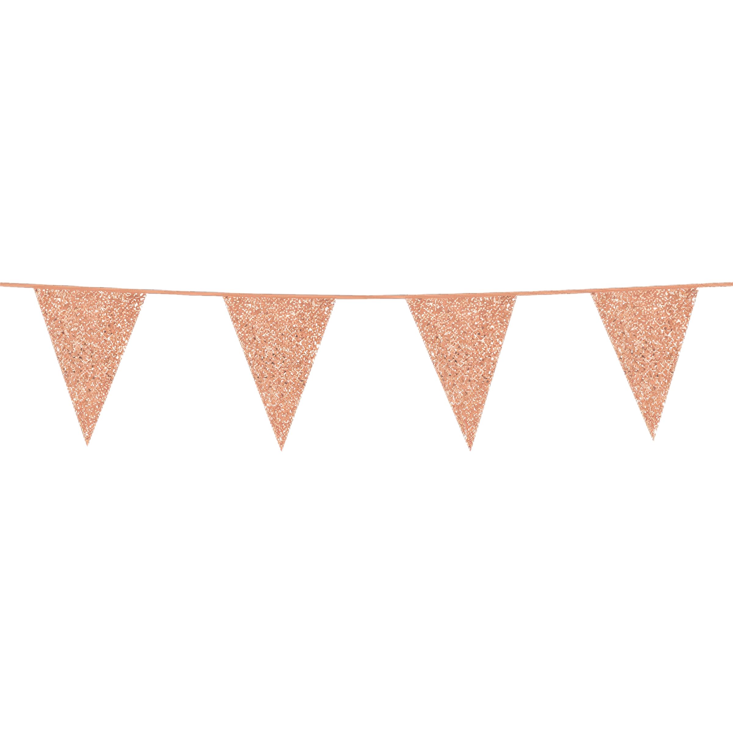 Flaggirlang Glitter Roséguld är en glittrande girland i nyans av roséguld. De trekantiga flaggorna fångar snyggt upp ljuset från både levande ljus och solen själv. Den totala längden på girlangen är ca 6 meter och vimplarna mäter ca 16 x 20 cm. Du hänger enkelt upp girlangen mellan två skruvar eller med hjälp av lite tejp. Du kan även använda den som en effektfull bordsdekoration. Säljs i 1-pack.