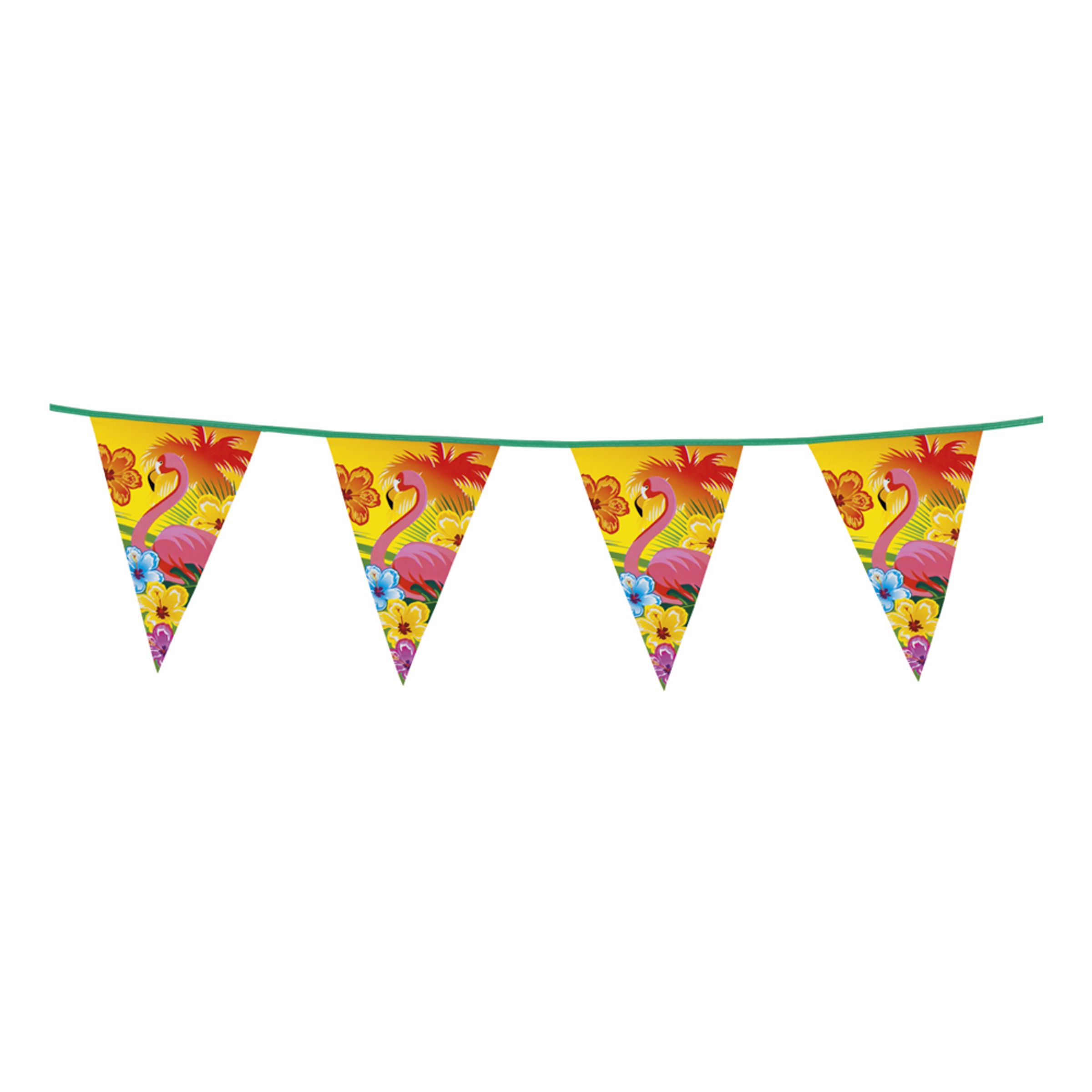 Flaggirlang Hibiscus är en del av vår Hibiscus-serie med olika festtillbehör såsom engångsmuggar, tallrikar, servetter och nu även det här jättefina flaggspelet med samma motiv. I motivet ser du en palm, flamingo, solnedgång och en vacker hibiscus.