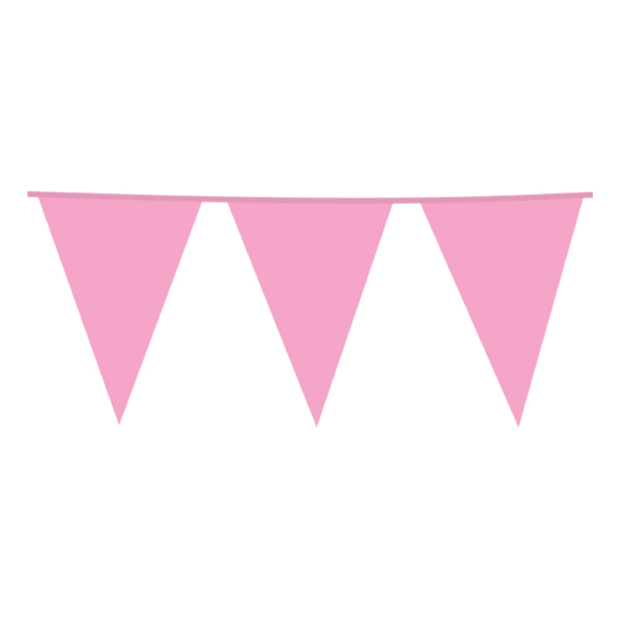 Flaggirlang Rosa är en rosa girlang i plast med trekantiga flaggor. Flaggorna är 30 x 45 cm stora och den totala längden på girlangen är tio meter. Du hänger enkelt upp girlangen mellan två skruvar eller med hjälp av lite tejp.