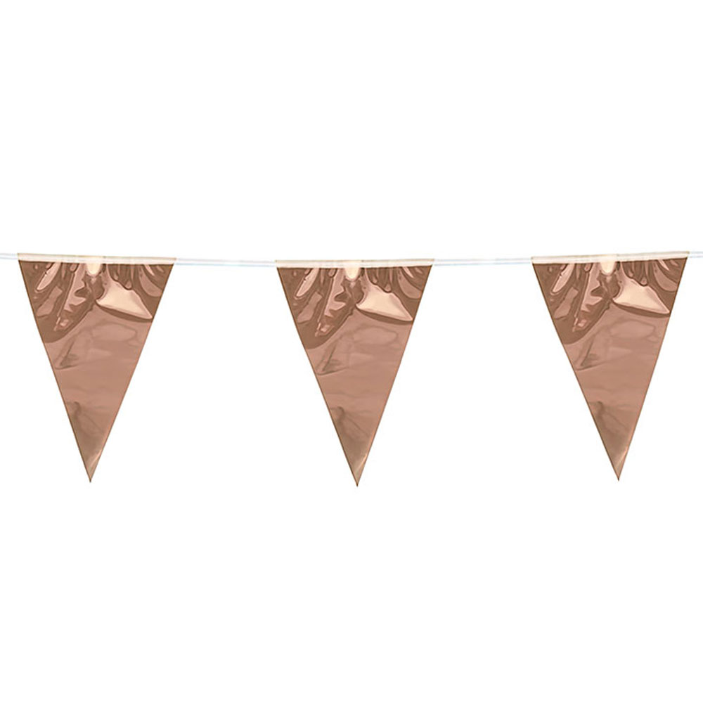 En lång och härlig vimpelgirlang full av flaggor i roseguld som blir en fin dekoration till fest och födelsedag eller för den som vill ha lite bling bling i vardagen, en superfin flaggirlang att hänga upp i vardagsrummet eller utomhus, perfekt girlang för alla som vill ha party och fest stämning med härligt glansiga vimplar.