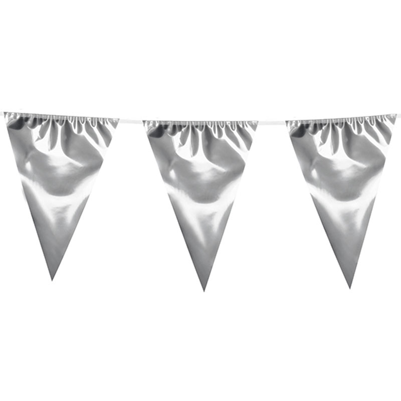 Flaggirlang Silver XL är en girlang bestående av 18 st silverfärgade metallicvimplar i varianten XL .