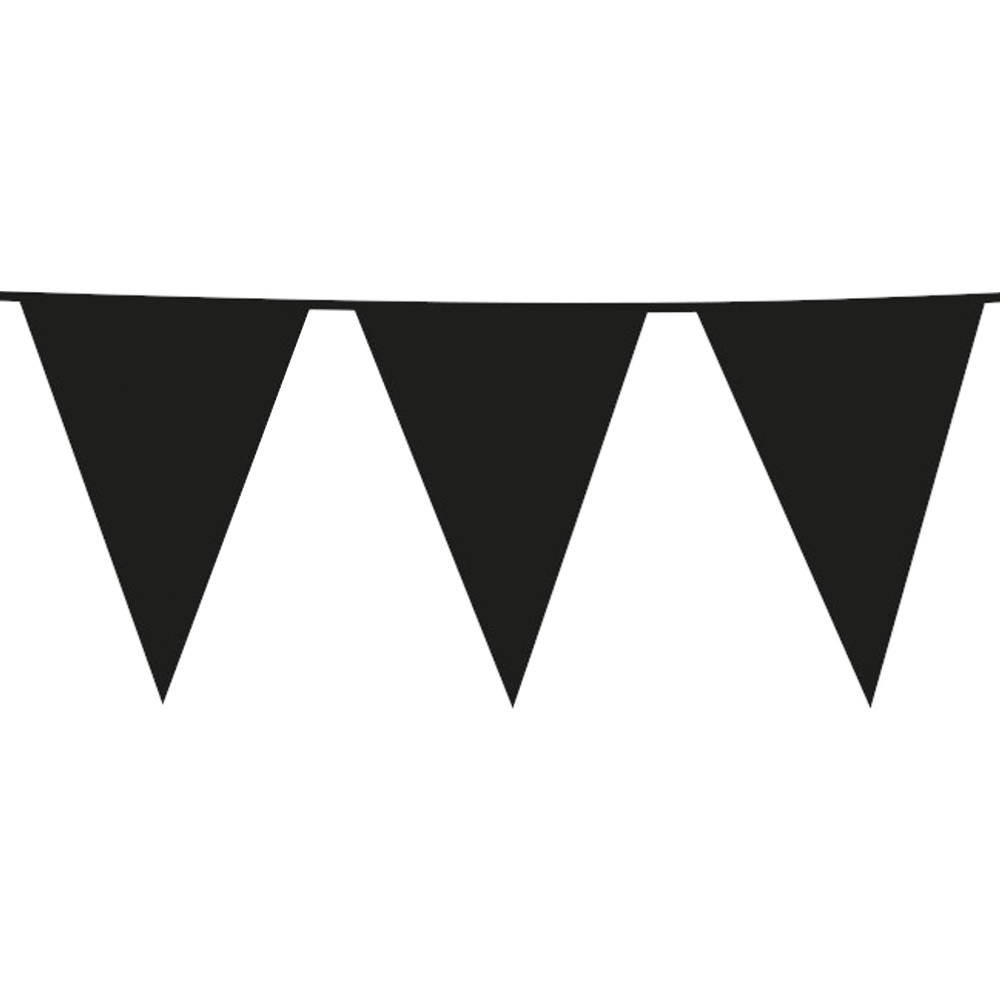 Flaggirlang Stor Svart innehåller en 10 meter lång girlang med 15 stycken lite större flaggor, girlangens vimplar är gjorda i plast och funkar utmärkt att användas utomhus.
