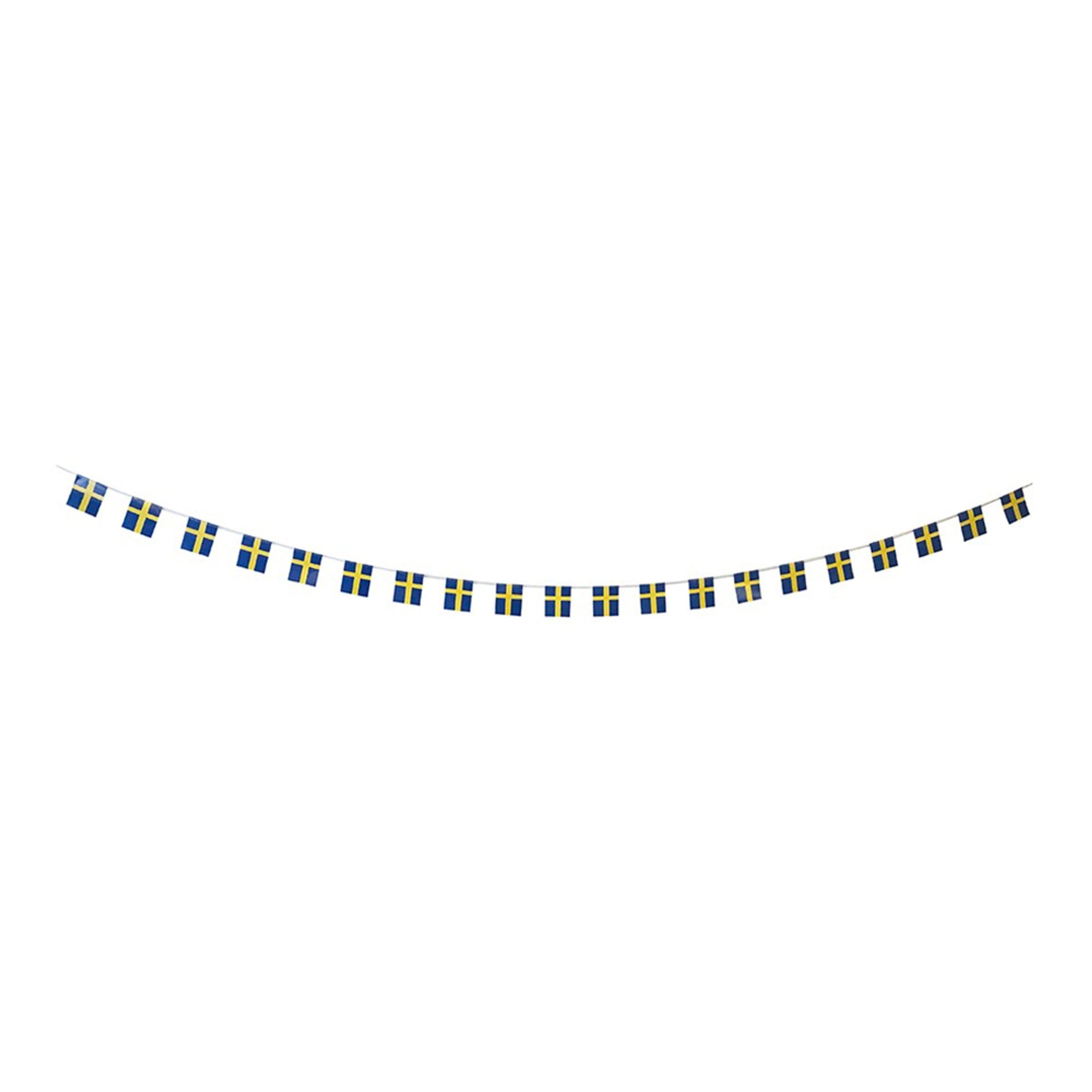 Med den här snygga girlangen med svenska flaggor går det snabbt och enkelt att skapa en härlig vinnarstämning i rummet när ni ska heja fram Sverige vid ett stort sportevenemang eller under Eurovision Song Contest. Girlangen blir också en fin dekoration på ett sommarkalas, en studentuppvaktning eller på Sveriges nationaldag.