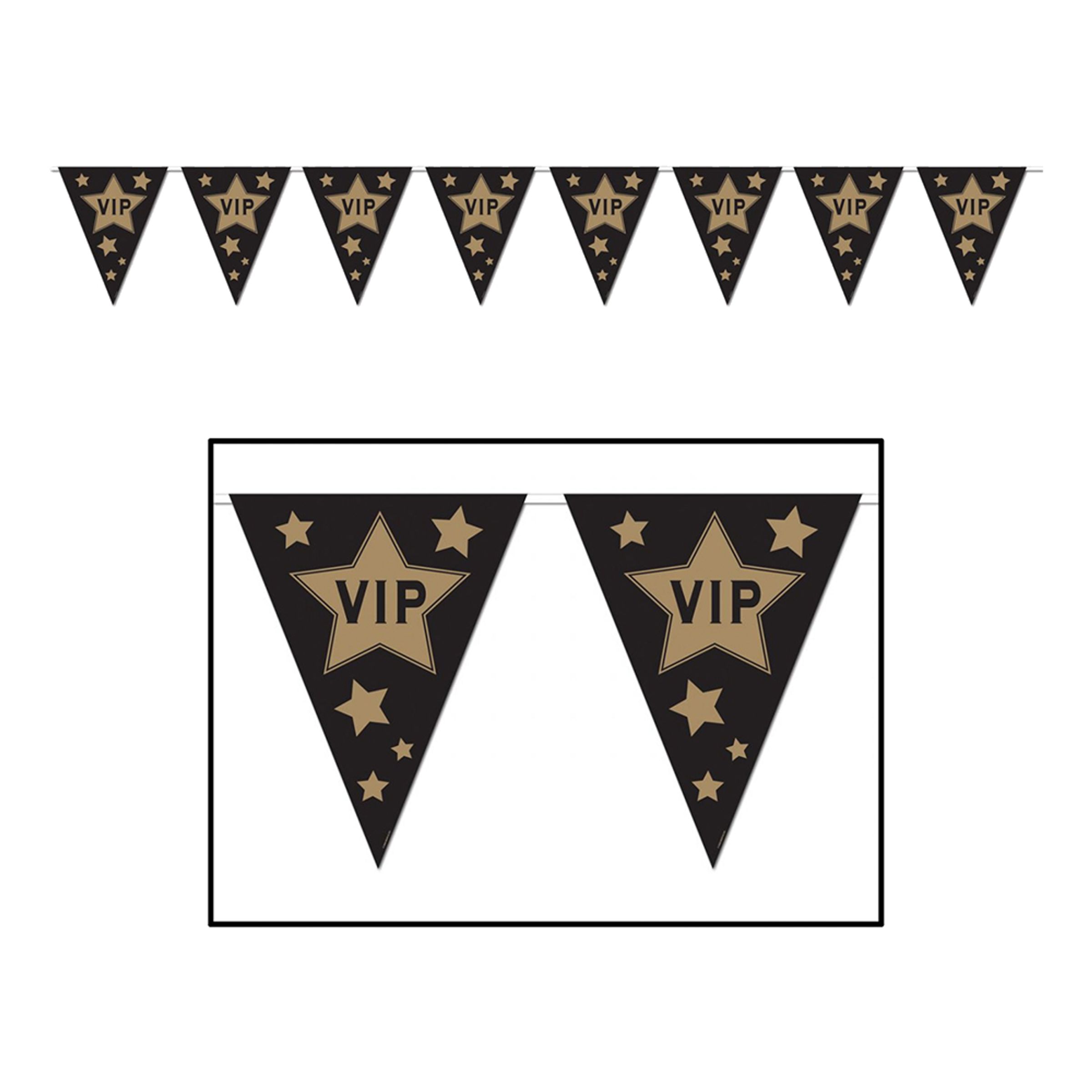 Flaggirlang VIP är en klassisk flaggirlang som består av ett snöre med hängande flaggor i svart som har tryck i guld. Girlangen har totalt 12 stycken flaggor och kan enkelt fästas med en bit tejp eller liknande.