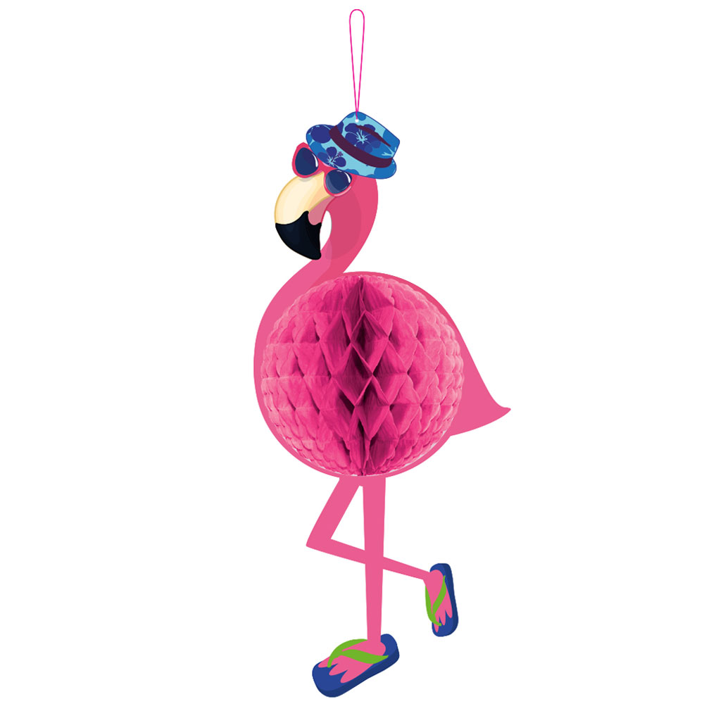 Flamingo Honeycomb Dekoration omfattar en rosa honeycomb som omgivs av en pappersdekoration i form av en rosa flamingo med blommig hatt, sandaler och solglasögon.