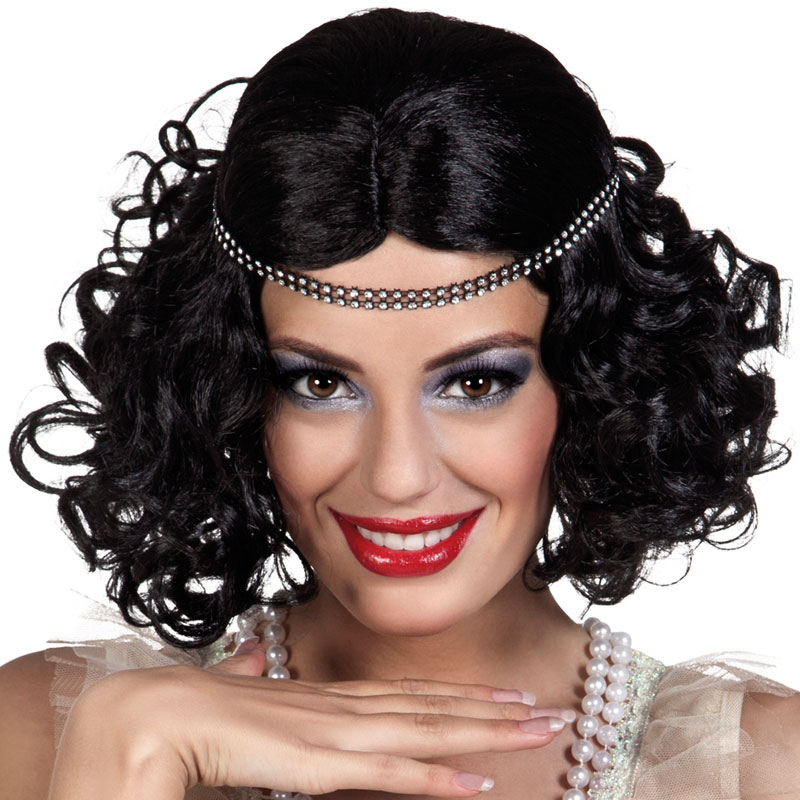 Flapper 20-tals Peruk Svart med Hårband omfattar en svartfärgad, lockig peruk med inkluderande hårband som har smycken i imitation av diamantstenar placerade omkring.