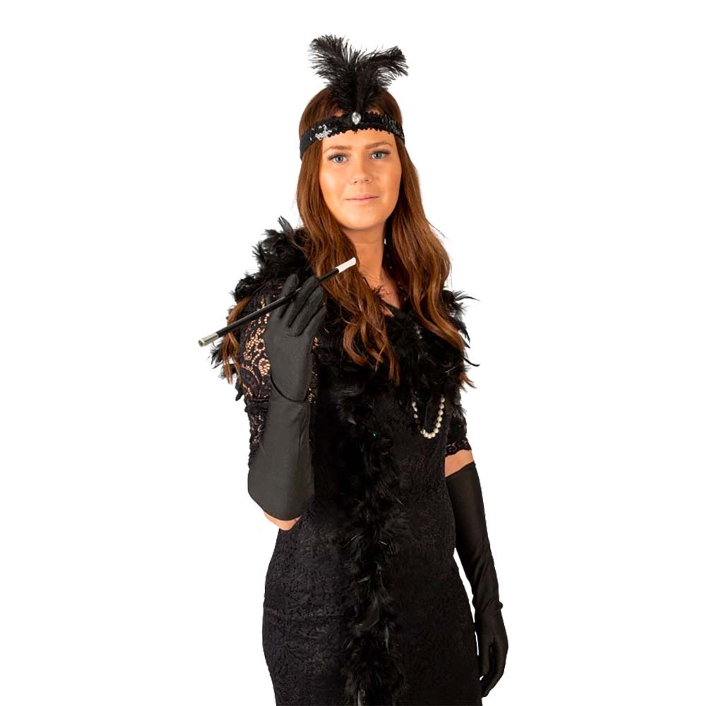 Flapper Tillbehörsset inkluderar ett svart pannband med en fjäder, cigaretthållare, en svart fjäderboa, ett par långa sidenhandskar samt ett vitt pärlhalsband!