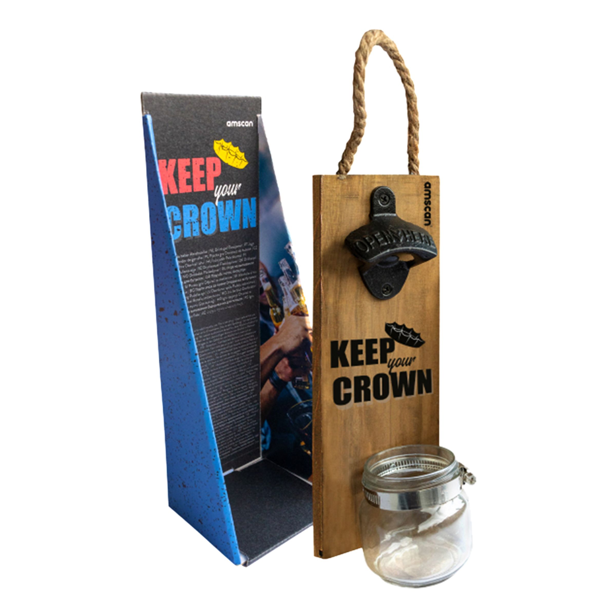 Flasköppnare med Hållare för Kapsyler består av en träplanka med fastskruvad kapsylöppnare och en skål där du kan lägga kapsylerna i. På plankan står det "Keep Your Crown" tryckt på framsidan. Du hänger enkelt fast den över en skruv eller krok med hjälp av repet.
