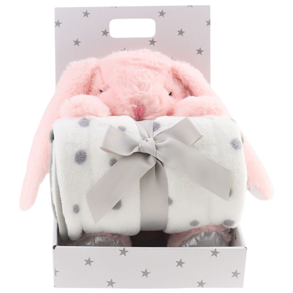 Fleecefilt & Gosedjur Rosa Kanin består av ett rosa gosedjur i form av en kanin och en vit fleecefilt med grå prickar och kanter.