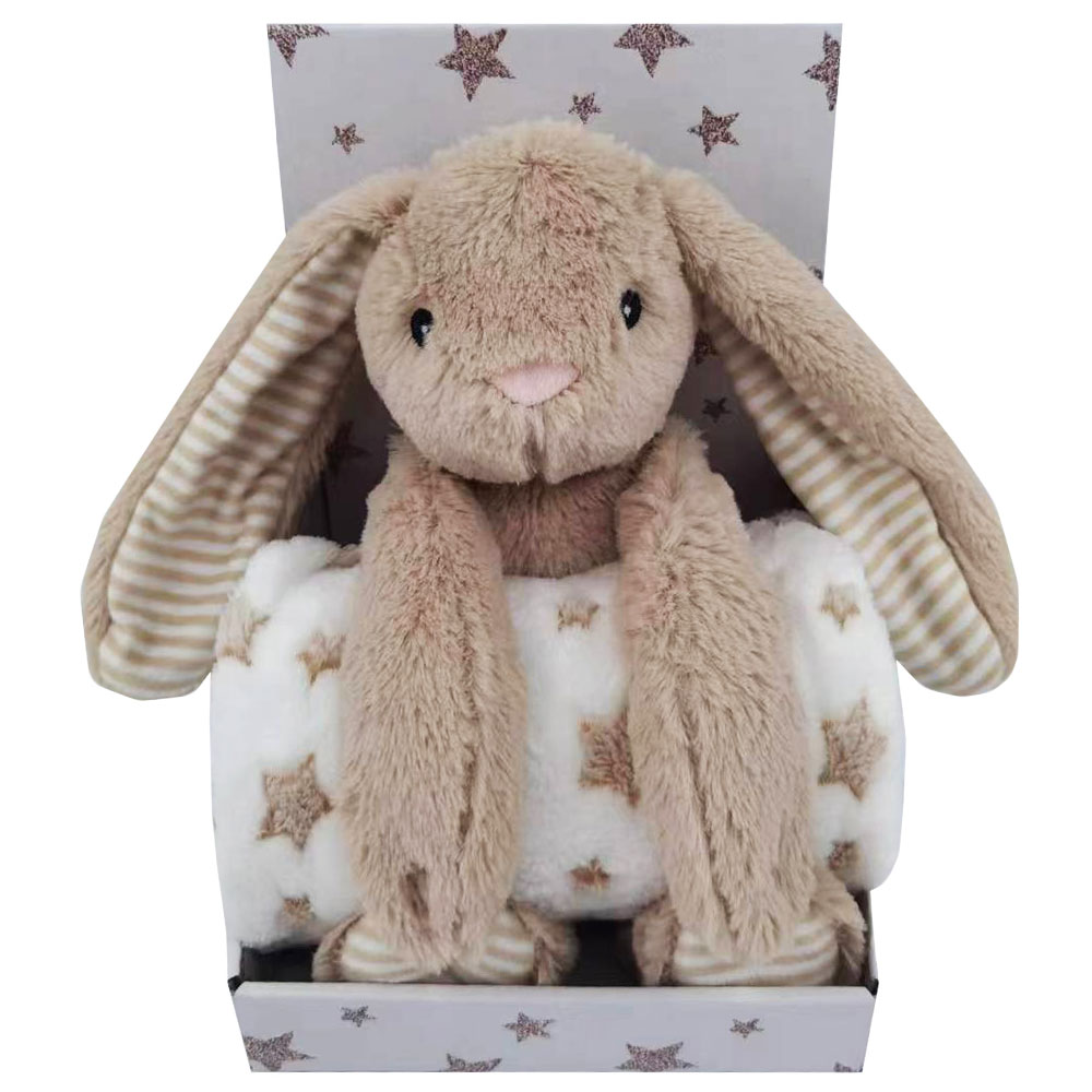 Förgyll mysstunden för ditt barn med denna tjusiga fleecefilt med beige kanin plush. Idealisk för både lekfulla stunder och vilsamma tupplurer. Skäm bort ditt barn med denna unika kombination av mjuk barnfilt och gulligt kanin-gosedjur. Den vita filten är prydd med bruna stjärnor och fungerar perfekt som en värmekälla när det är dags för saga. Det beiga kanin-gosedjuret adderar lekvänligt uttryck och tillför en extra dos av gosig lyx till filten.