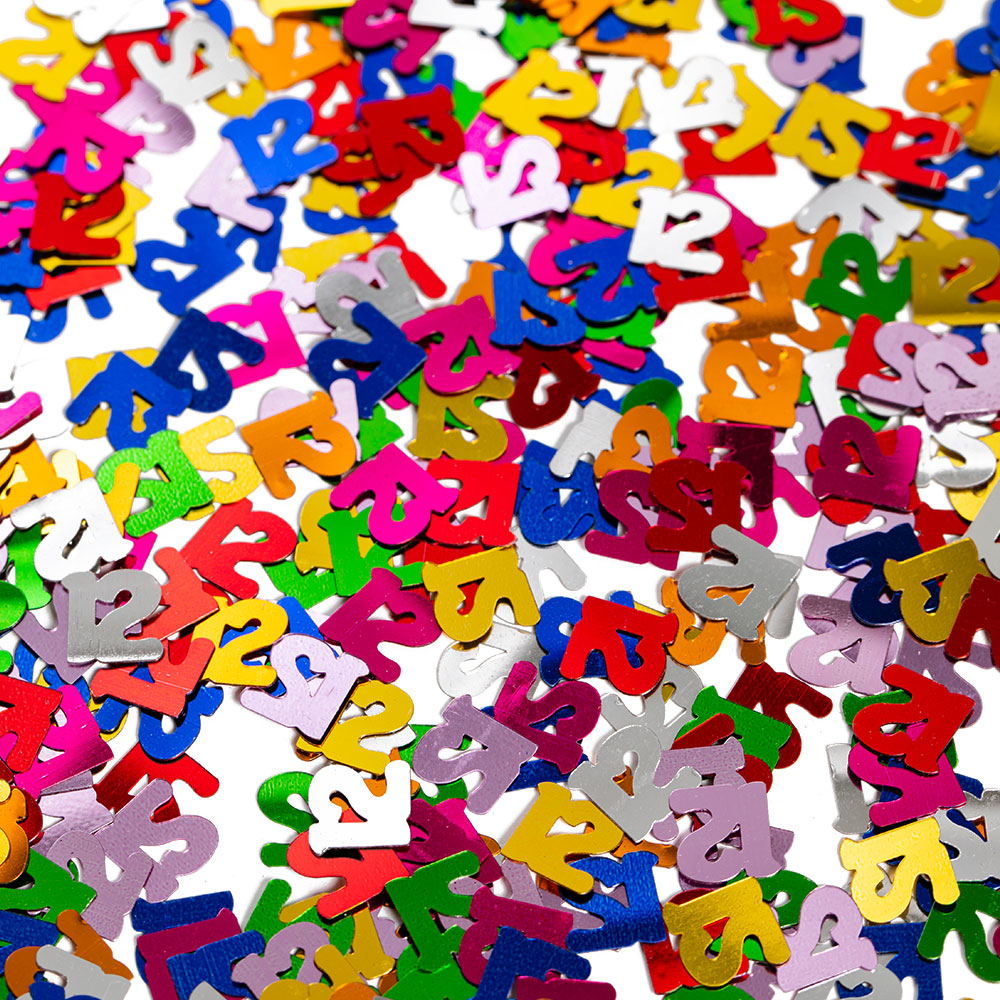 Flerfärgad Konfetti 12 år omfattar 14 gram konfetti som föreställer tolvor i flera olika färger.
