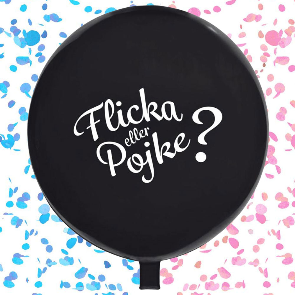 Flicka eller Pojke Konfettiballong består av en stor, svart ballong med en vit "Flicka eller pojke?" text på båda sidorna. Ingår även blå och rosa konfetti att fylla ballongen med. Blås upp ballongen med luft eller helium. Tillverkad av latex.