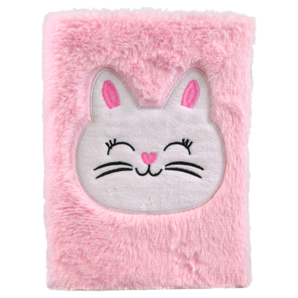 Fluffig Skrivbok Katt innehåller en rosa fluffig skrivbok med ett mjukt motiv av en vit katt på framsidan.