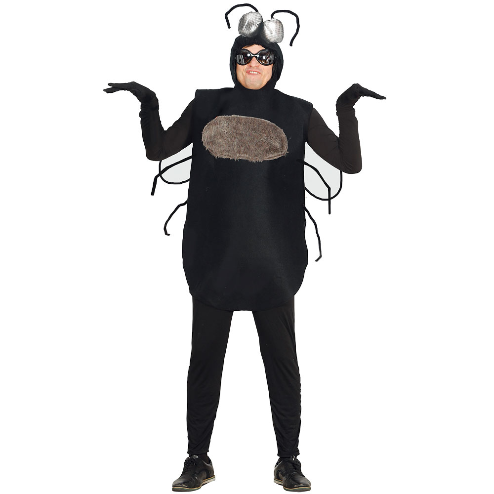 Fluga Maskeraddräkt består av svart helkroppsoverall i form av en fluga med vadderad front, svart huva och ett par genomskinliga vingar. Dräkten är tillverkad i polyester och kommer i one size (vuxenstorlek).