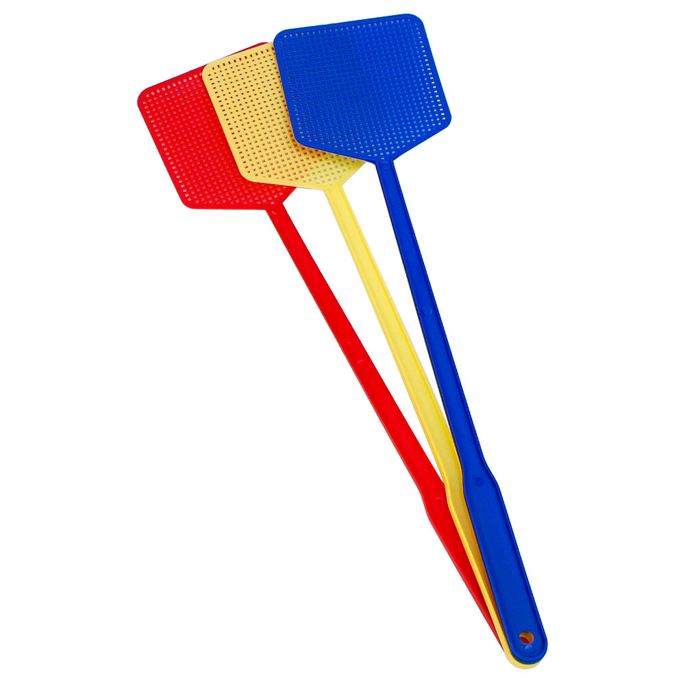 Flugsmällare består av ett redskap att döda flugor med. Smällan mäter ungefär 46 centimeter lång och är tillverkad i plast. Säljs i 3-pack.