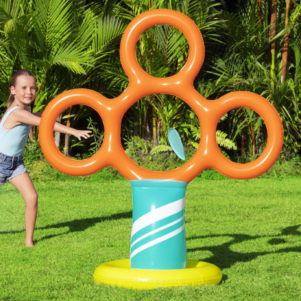 Flying Fun med Frisbee Spel omfattar ett frisbee-spel för hela familjen som består av en uppblåsbar bas med fyra ringar samt fyra stycken frisbees. Basen kan fyllas med vatten för ökad stabilitet och kommer även med slitstark lagningslapp. Spelet går ut på att kasta frisbees genom basens fyra målringar, den spelare som gör mål flest gånger vinner.