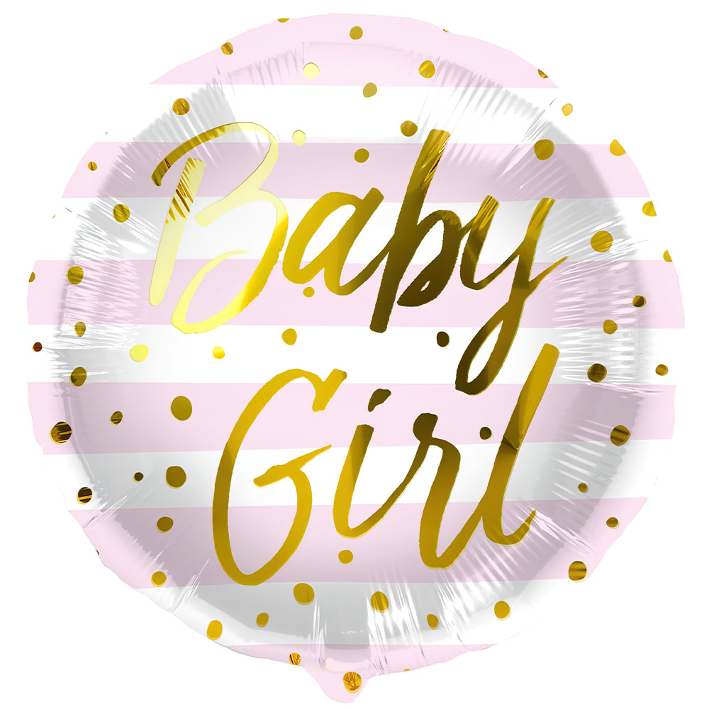 Folieballong Baby Girl omfattar en rund rosa- och vitrandig folieballong med guldiga prickar och texten "Baby Girl" i guldig snirklig stil. Ballongen fylls med helium eller luft, har självförslutande ventil och rymmer ca 18 liter.