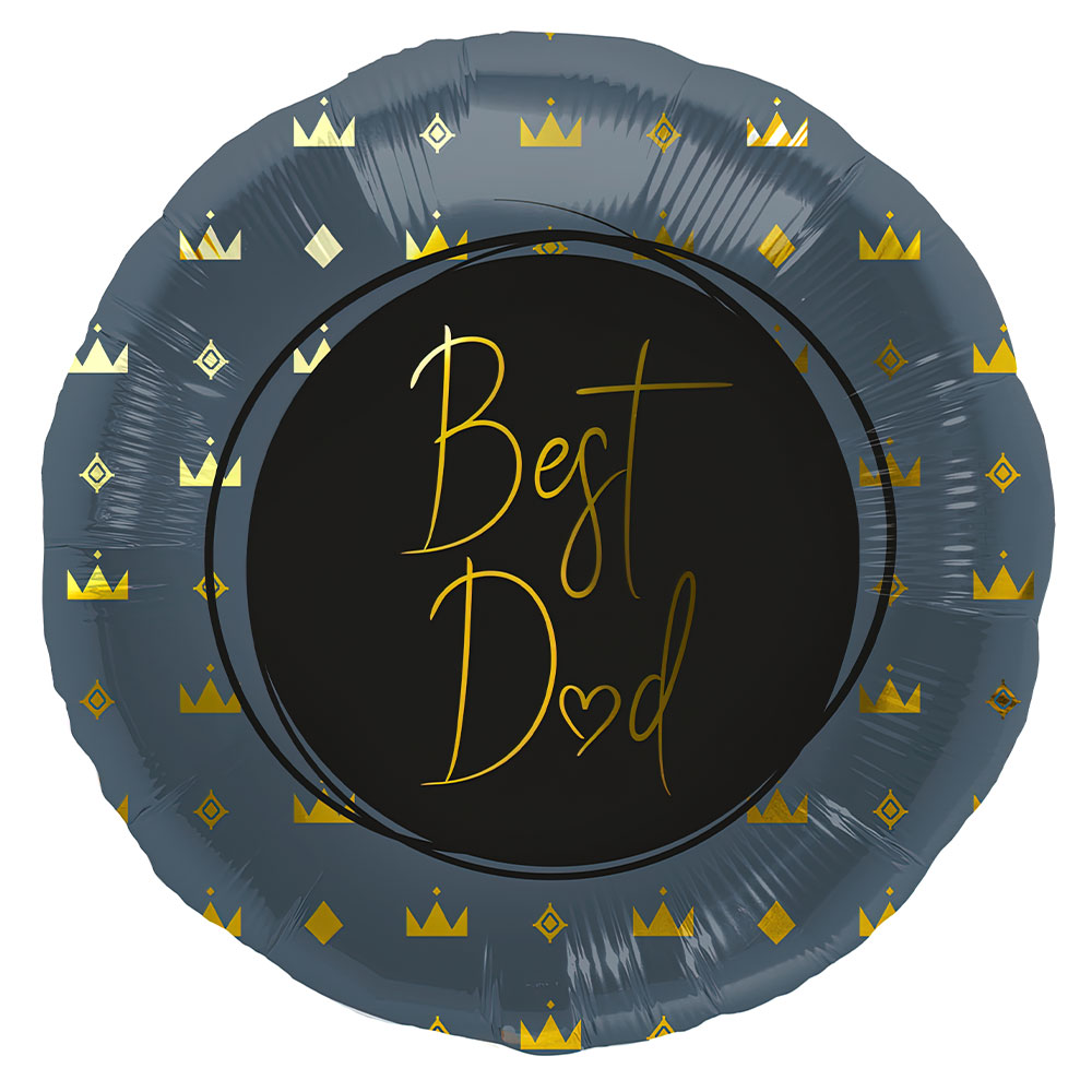 Folieballong Best Dad omfattar en rund ballong i folie med blå kant med motiv av guldkronor samt svart mitt med texten "Best Dad" i smal guldtext. Ballongen är ca 45 cm stor och fylls med luft eller helium och rymmer ca 18 liter.