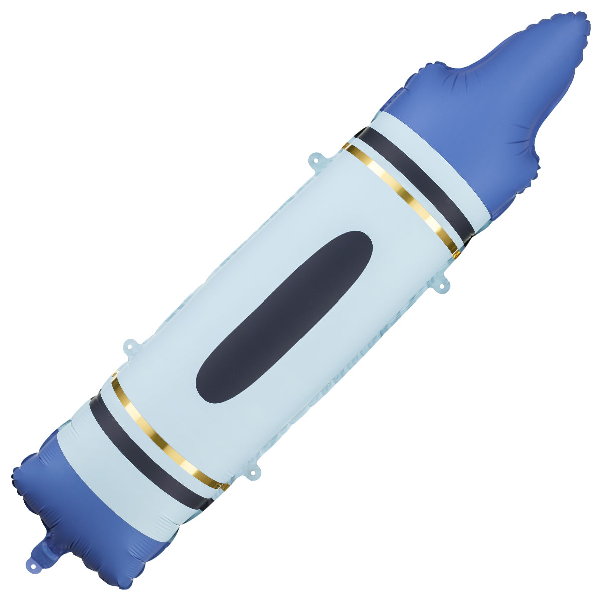 Folieballong Blå Krita omfattar en folieballong i form av en blå krita, dekorerad med ljusblått omslag med svarta och guldiga detaljer. Ballongen kan fyllas med luft med det medföljande sugröret eller med helium.