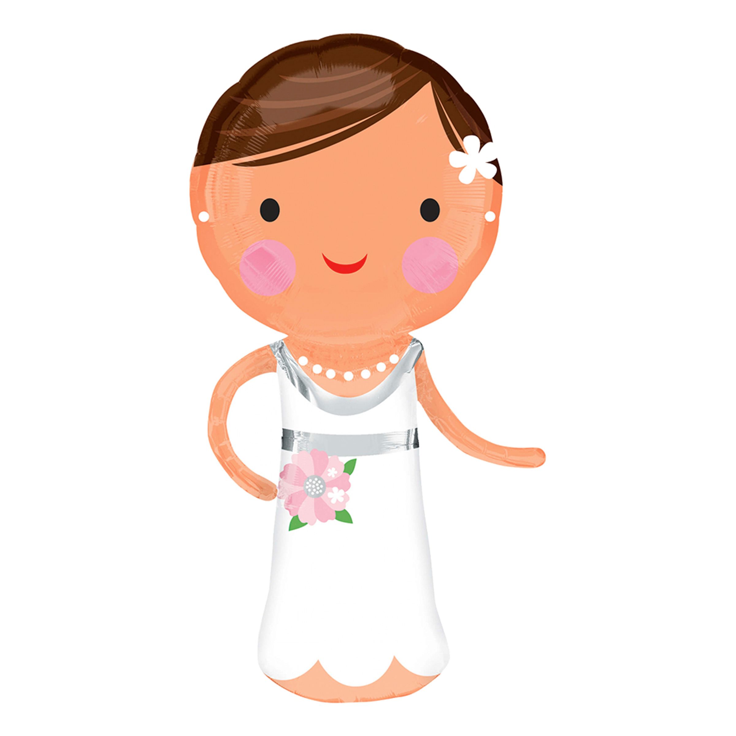 Kan du föreställa dig en ballong som ser ut som en brud? Kolla in den här ballongen! Den är formad som en vacker tjej med vit brudklänning, en blombukett, ett pärlhalsband och en blomma i håret. En perfekt dekoration på en möhippa, en förlovningsfest eller ett bröllop!