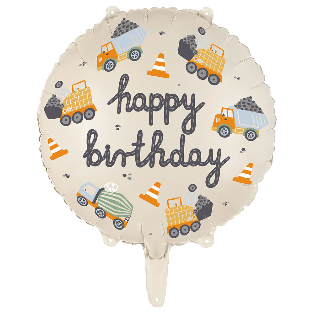 – Folieballong med byggfordon motiv och text "happy birthday".