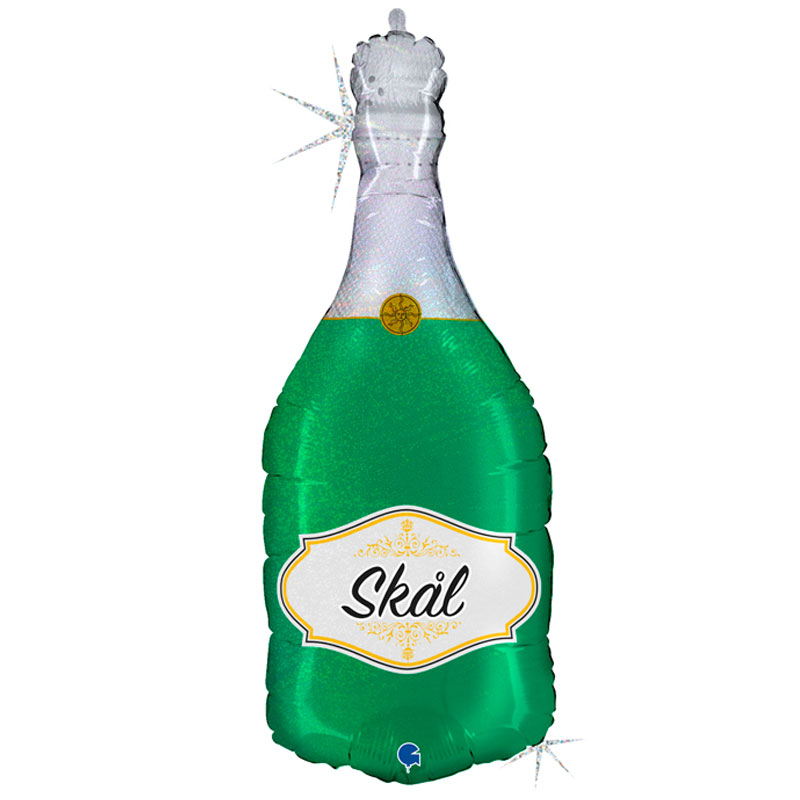 Folieballong Champagneflaska Skål består av en folieballong som föreställer en glitter-grön champagneflaska med en vit etikett och texten "Skål".