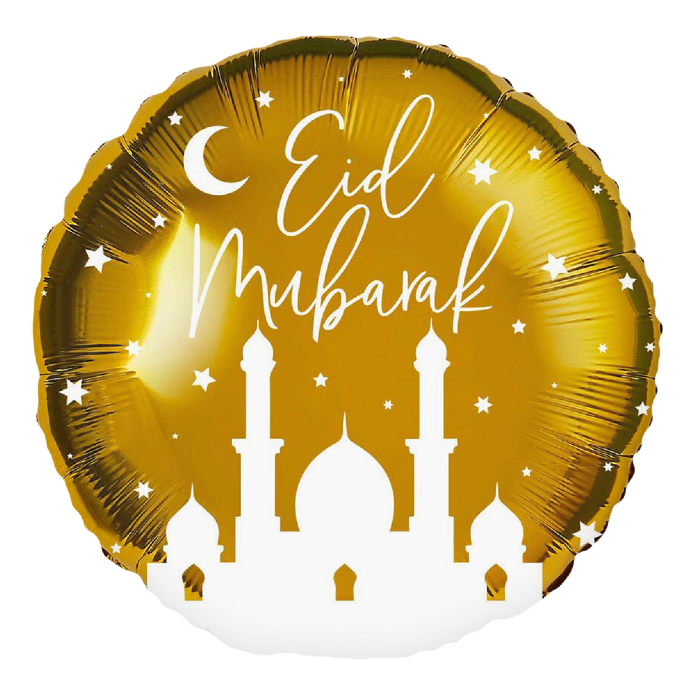 Folieballong Eid Mubarak Guld är en rund ballong i skimrande guld tryckt med texten "Eid Mubarak" med stjärnor och allt. Perfekt till den stora festen! Köp gärna till helium och fyll den med så den svävar sådär härligt också.