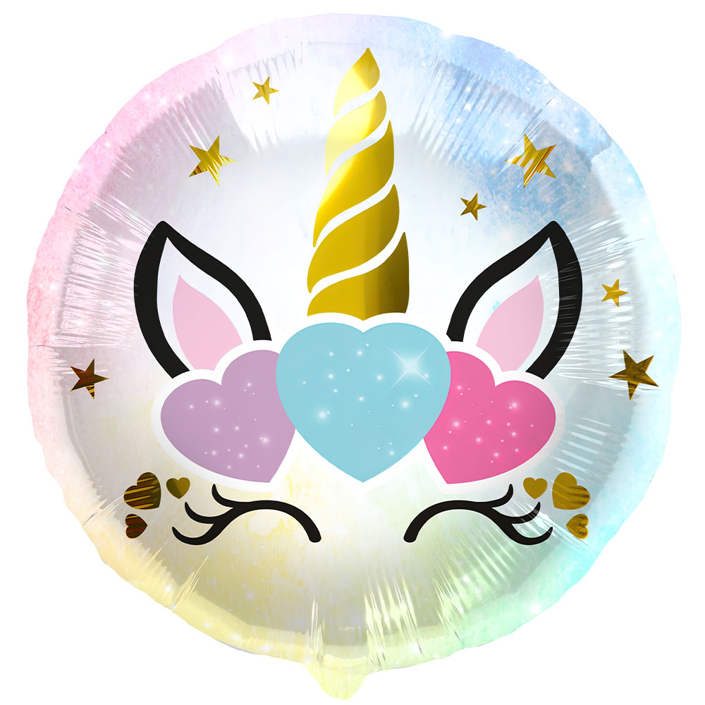 Folieballong Enhörning Guld och Pastell omfattar en rund och glansig folieballong med motiv av ett enhörningshuvud med hjärtan i lila, blått och rosa och ett guldigt enhörningshorn samt svarta ögon och öron och guldiga detaljer. Ballongen är ca 45 cm stor och rymmer ca 18 liter, fylls med luft eller helium och har självförslutande ventil.