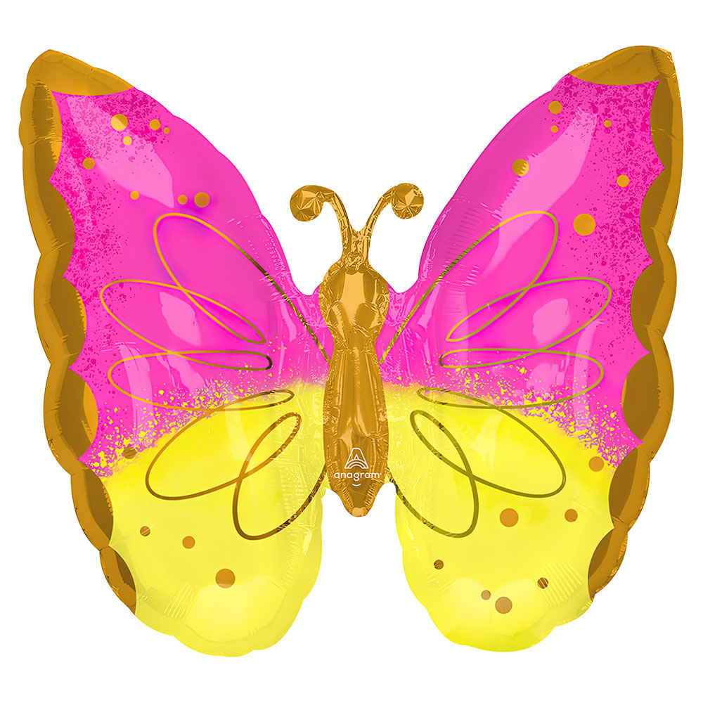 Folieballong Fjäril omfattar en folieballong i form av en fjäril i rosa, gult och guld. Ballongen blåses upp med luft eller helium och mäter ca 63 x 63 cm.