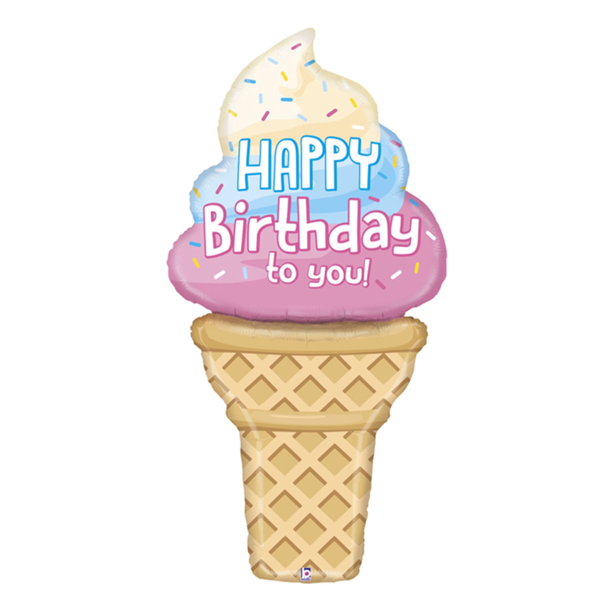 Folieballong Glass Happy Birthday To You är en stor ballong i folie i form av en trefärgad mjukglass med strössel på toppen. Du fyller ballongen med antingen luft eller helium. Om du fyller den med helium blir flygtiden upp till sju dagar. Ballongen är ca 152 cm och har en självförslutande ventil.