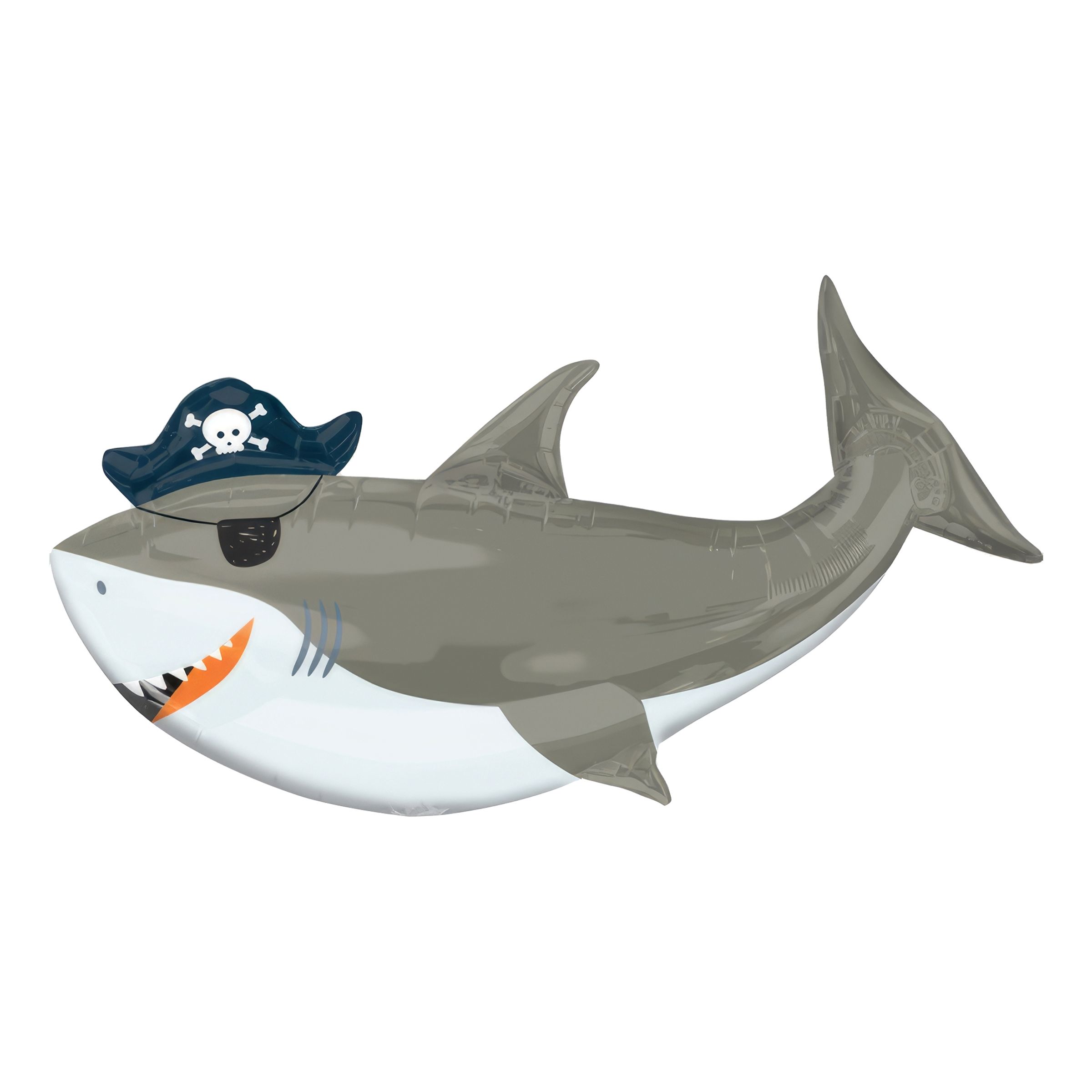 Skepp ohoj, piratkalas i sikte! Men inte utan att du först fyller hela lokalen med dekorationer, ballonger och piratprops från golv till tak – börja med den här helfestliga hajballongen!