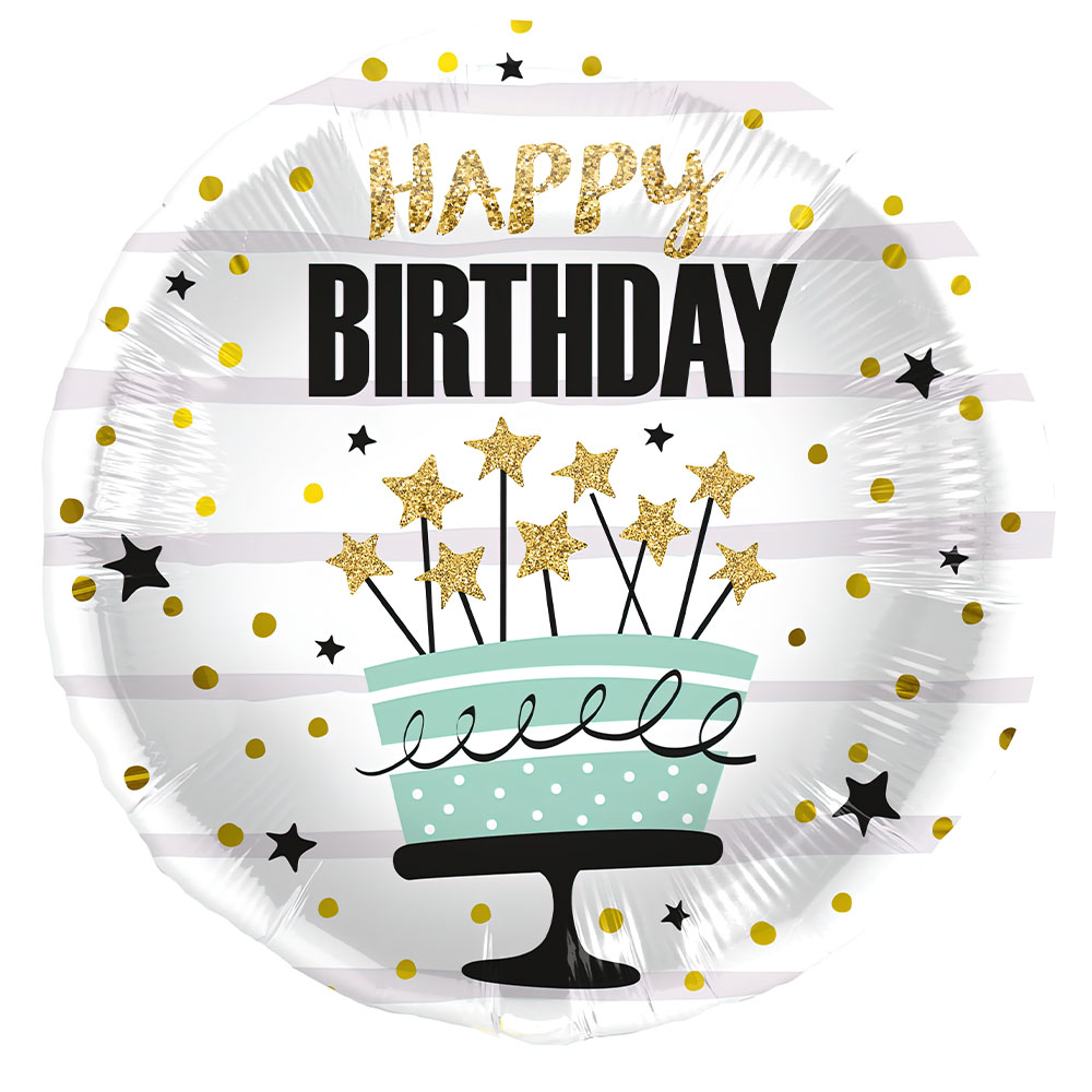 Folieballong Happy Birthday Tårta omfattar en rund, vit och glansig folieballong med "Happy Birthday" text och motiv av en turkos tårta och detaljer med prickar och stjärnor i guld, svart, vitt. Ballongen är ca 45 cm och rymmer ca 18 liter, fylls med helium eller luft.