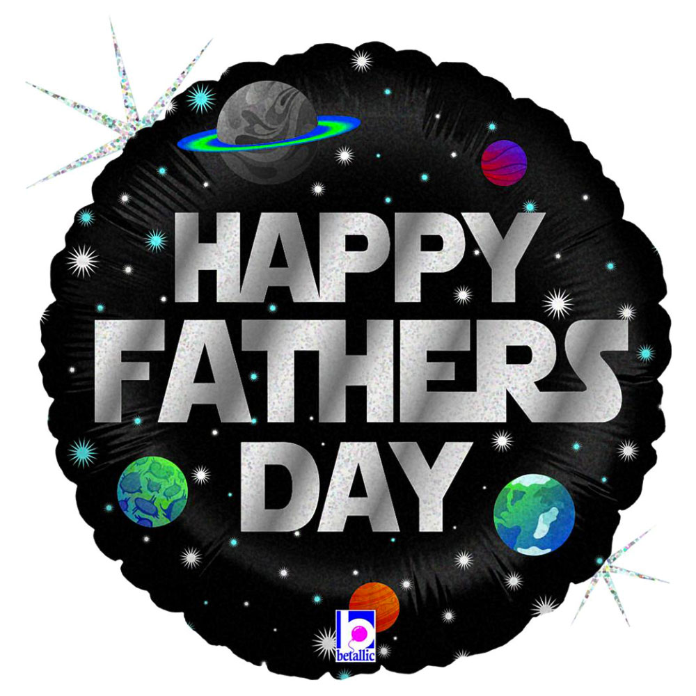 Folieballong Happy Fathers Day består av en svart rund folieballong med planeter och stjärnor i bakgrunden och den silvriga holografiska texten "Happy Fathers Day".