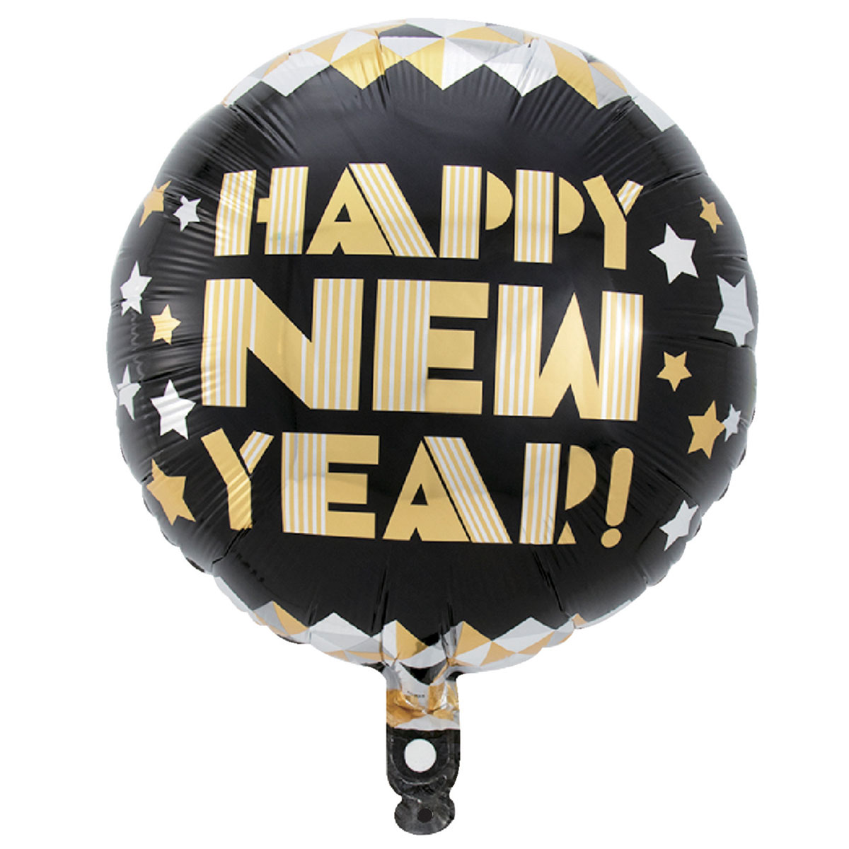 Folieballong Happy New Year omfattar en svart rund folieballong, dekorerad med guldiga och silvriga stjärnor, ett matchat diamantmönster samt texten "HAPPY NEW YEAR".