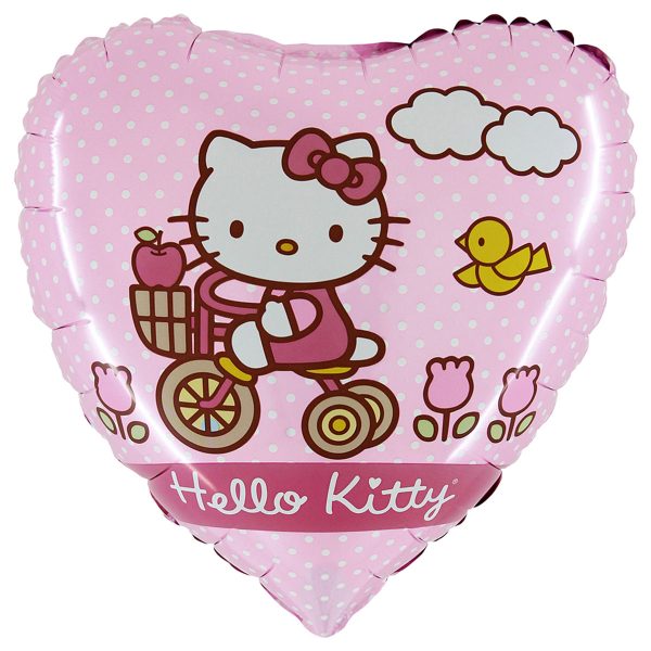 Folieballong Hello Kitty Bike omfattar en hjärtformad ljusrosa folieballong med vita prickar. På ballongen står texten "Hello Kitty" och den har ett motiv av en cyklande katt med blommor, moln och en fågel omkring sig.