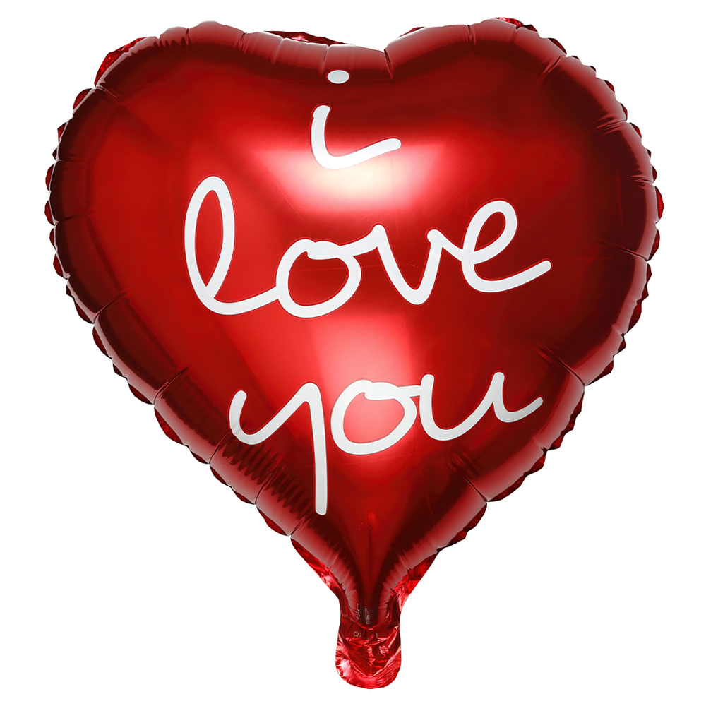 Folieballong Hjärta I Love You omfattar en hjärtformad folieballong i röd glansig färg med texten "I love you" med vita snirkliga bokstäver. Fylls med helium eller luft och har självförslutande ventil.