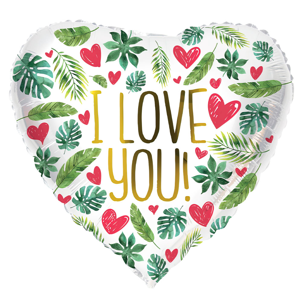 Folieballong Hjärta I Love You Växter omfattar en vit hjärtballong i folie med texten "I Love You!" i guld med motiv av små röda hjärtan och olika gröna växter och blad. Ballongen fylls med helium eller luft, har självförslutande ventil och rymmer ca 18 liter.