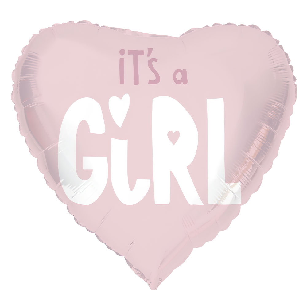 Folieballong Hjärta It's a Girl omfattar en hjärtformad folieballong i ljusrosa med texten "It's a girl" i mörkrosa och vitt. Ballongen rymmer ca 18 liter och fylls med helium eller luft och är ca 45 cm stor.