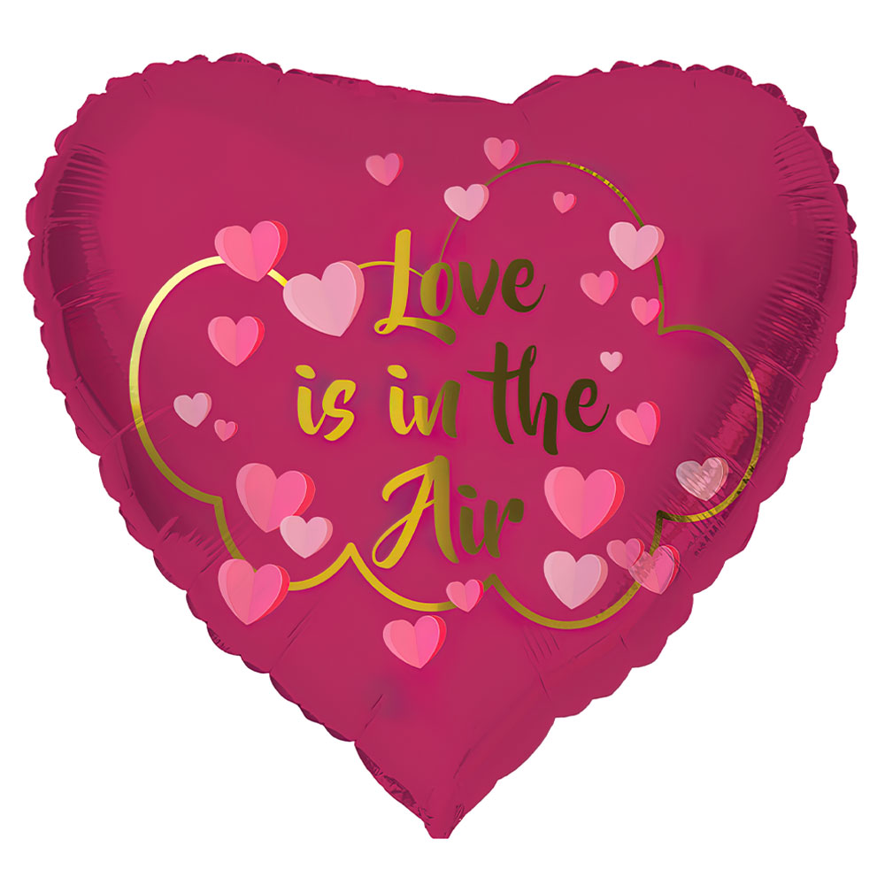Folieballong Hjärta Love Is In The Air omfattar en mörkrosa hjärtformad folieballong med motiv av små hjärtan samt texten "Love is in the Air" i snirkliga bokstäver i guld. Ballongen rymmer ca 18 liter och fylls med helium eller luft och har självförslutande ventil.