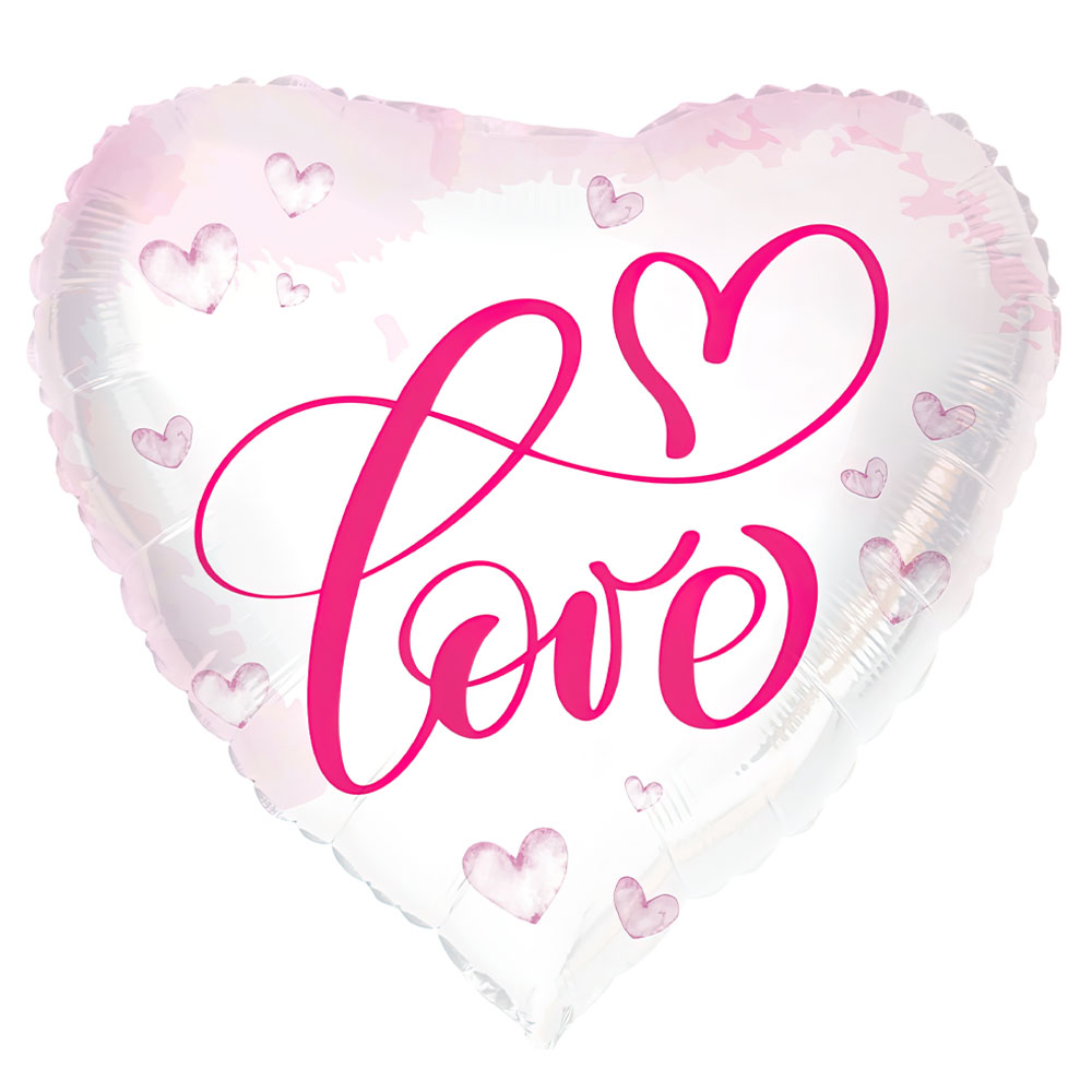 Folieballong Hjärta Love omfattar en hjärtformad folieballong i ljusrosa och vitt och motiv av små hjärtan samt texten "Love" i mörkrosa snirklig stil med ett hjärta ovanpå. Ballongen rymmer ca 18 liter och fylls med luft eller helium och har självförslutande ventil.