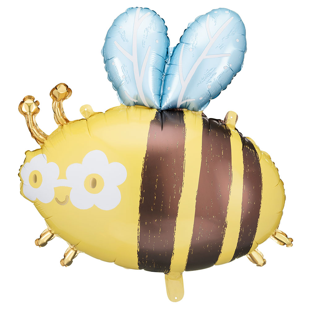 Folieballong Humla är en folieballong i form av en söt liten humla i gul, brun, vit med gyllene antenner och ben samt ljusblå vingar.