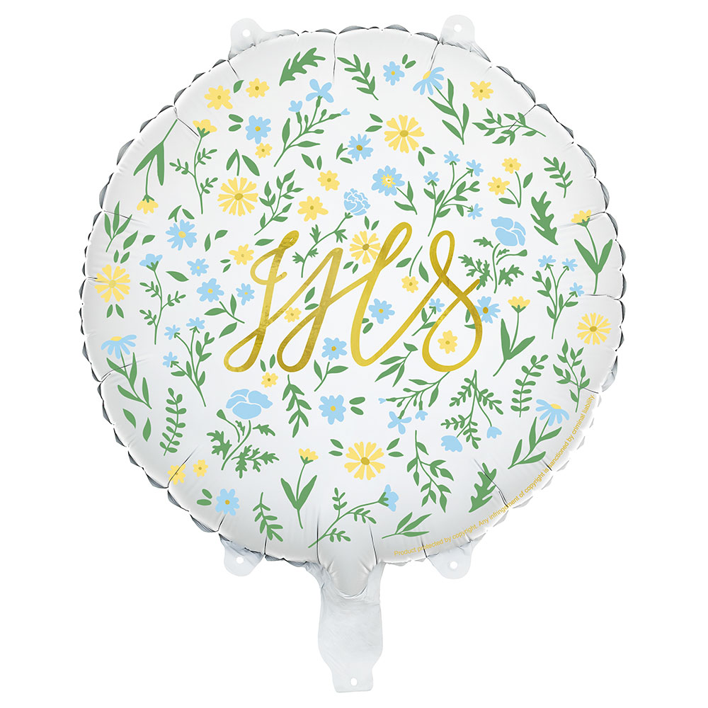 Folieballong IHS är en rund folieballong som är fylld med blå, gula och gröna blommönster och texten "IHS" i guld.