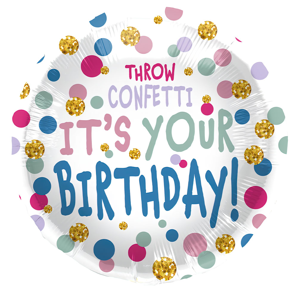 Folieballong It's Your Birthday omfattar en färgglad och rund folieballong i vitt med stora prickar och texten "Throw Confetti It's Your Birthday" i olika färger. Ballongen blir ca 45 cm och rymmer ca 18 liter, fylls med helium eller luft och har självförslutande ventil.