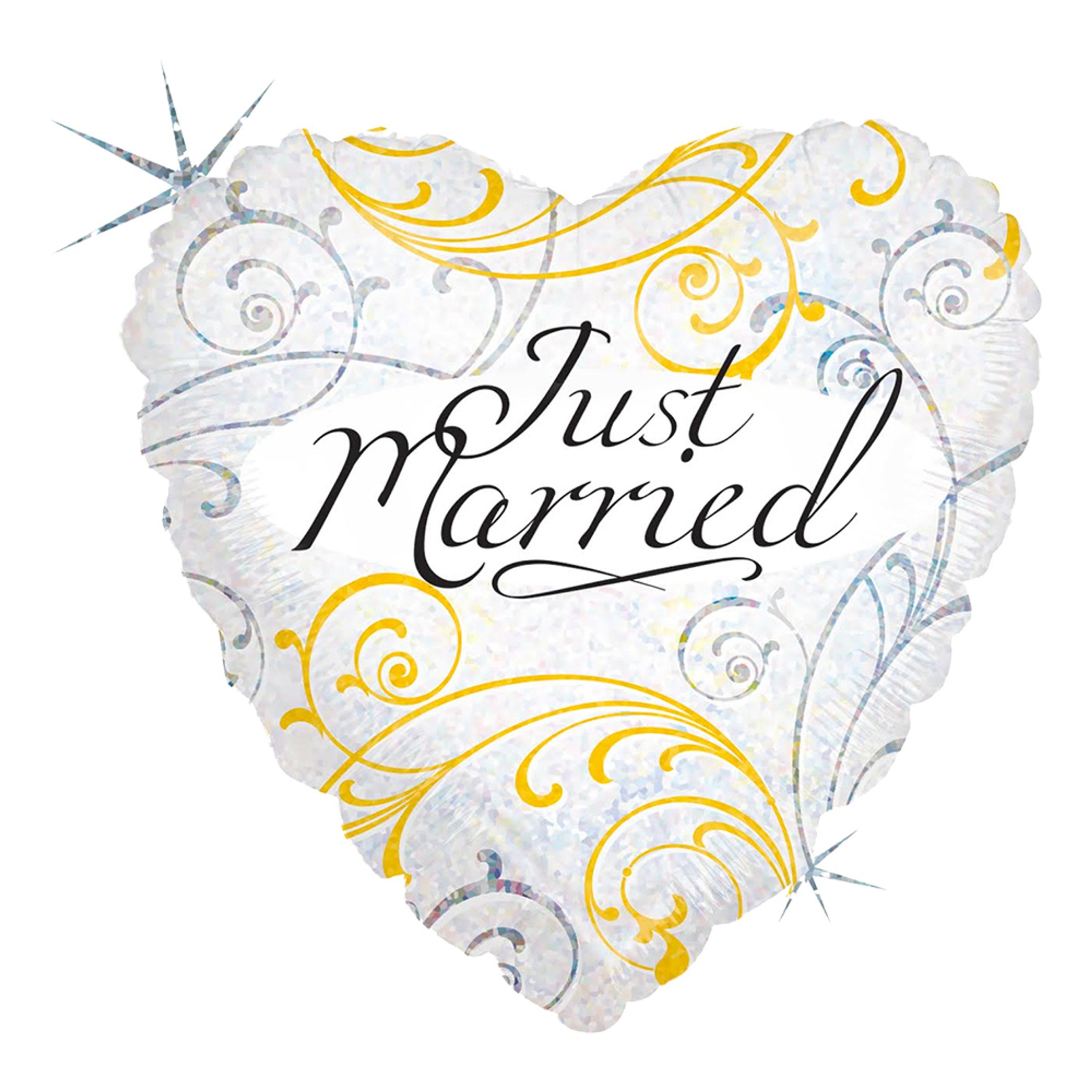 Folieballongen "just married" är formad som ett hjärta och kommer med dekorativa inslag av guld och silver.