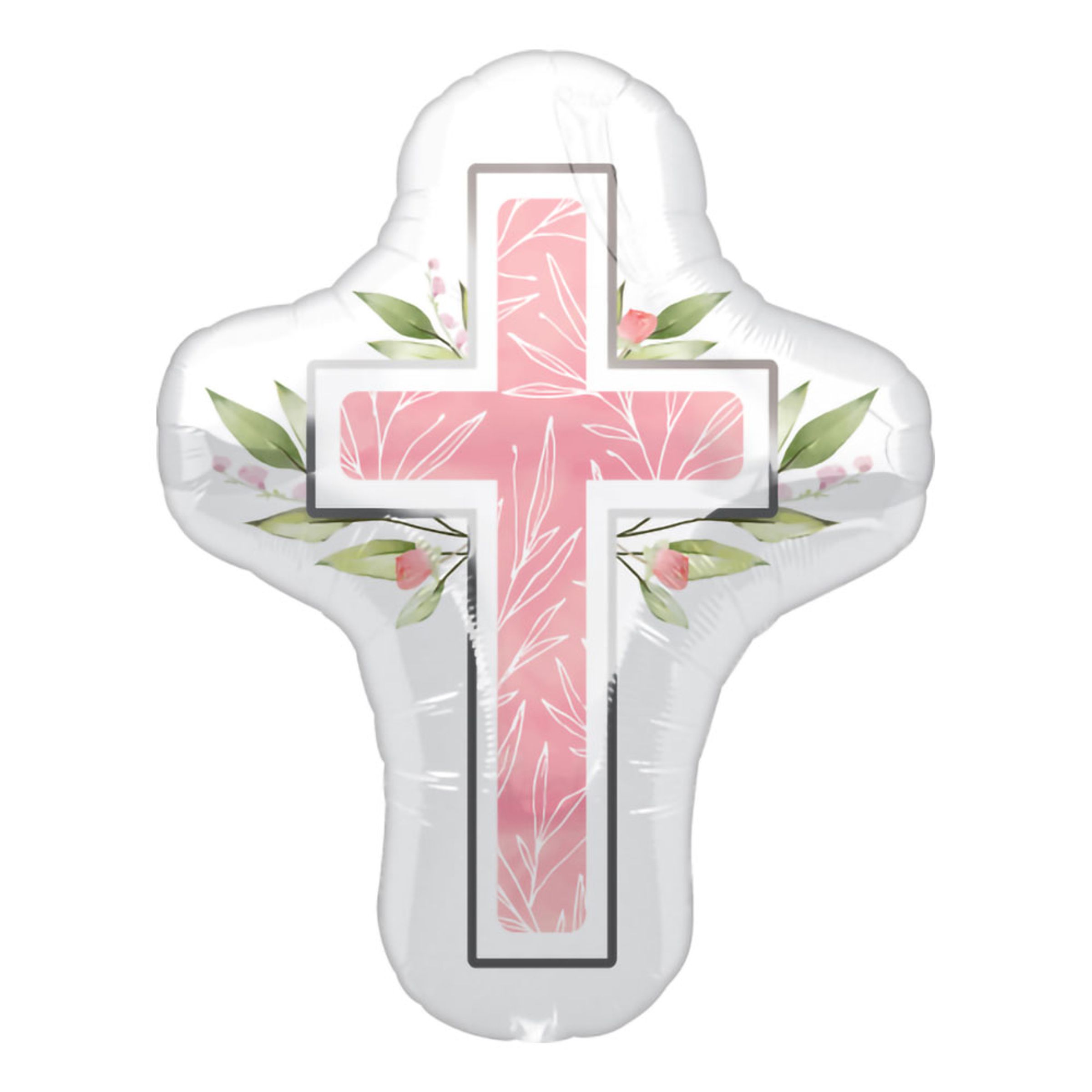 Folieballong Konfirmation Rosa Shape  är en ballong som kommer med motiv föreställande en rosa kors med gröna blad i bakgrunden. Ballongen går utmärkt att fylla med antingen luft eller helium för svävande effekt, vilket du givetvis hittar hos oss.
