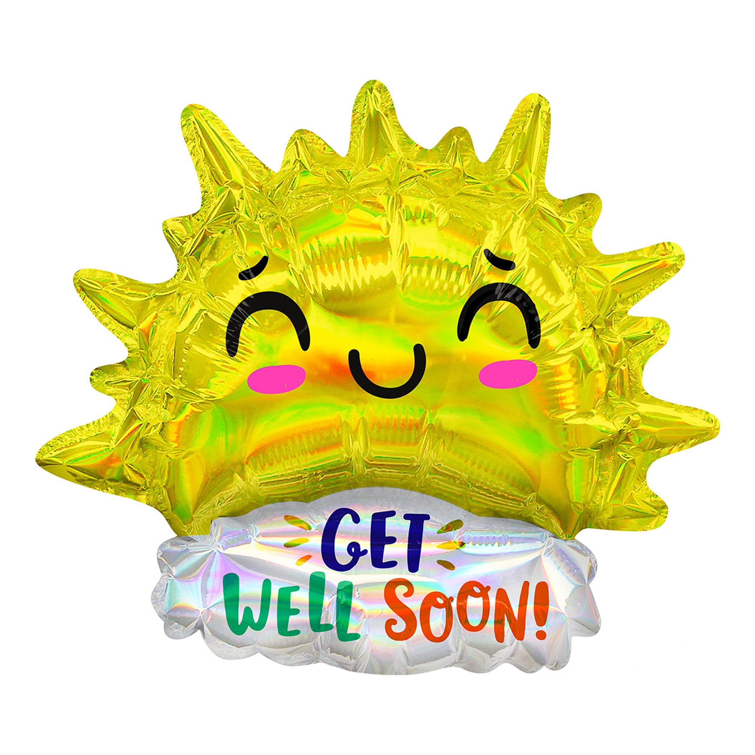 Folieballong Mini Get Well Soon är en ballong i form av en sol med ansikte och ett moln med texten "Get well soon!". En supersöt ballong att ge till en sjukling! Blåses enkelt upp med ett sugrör.